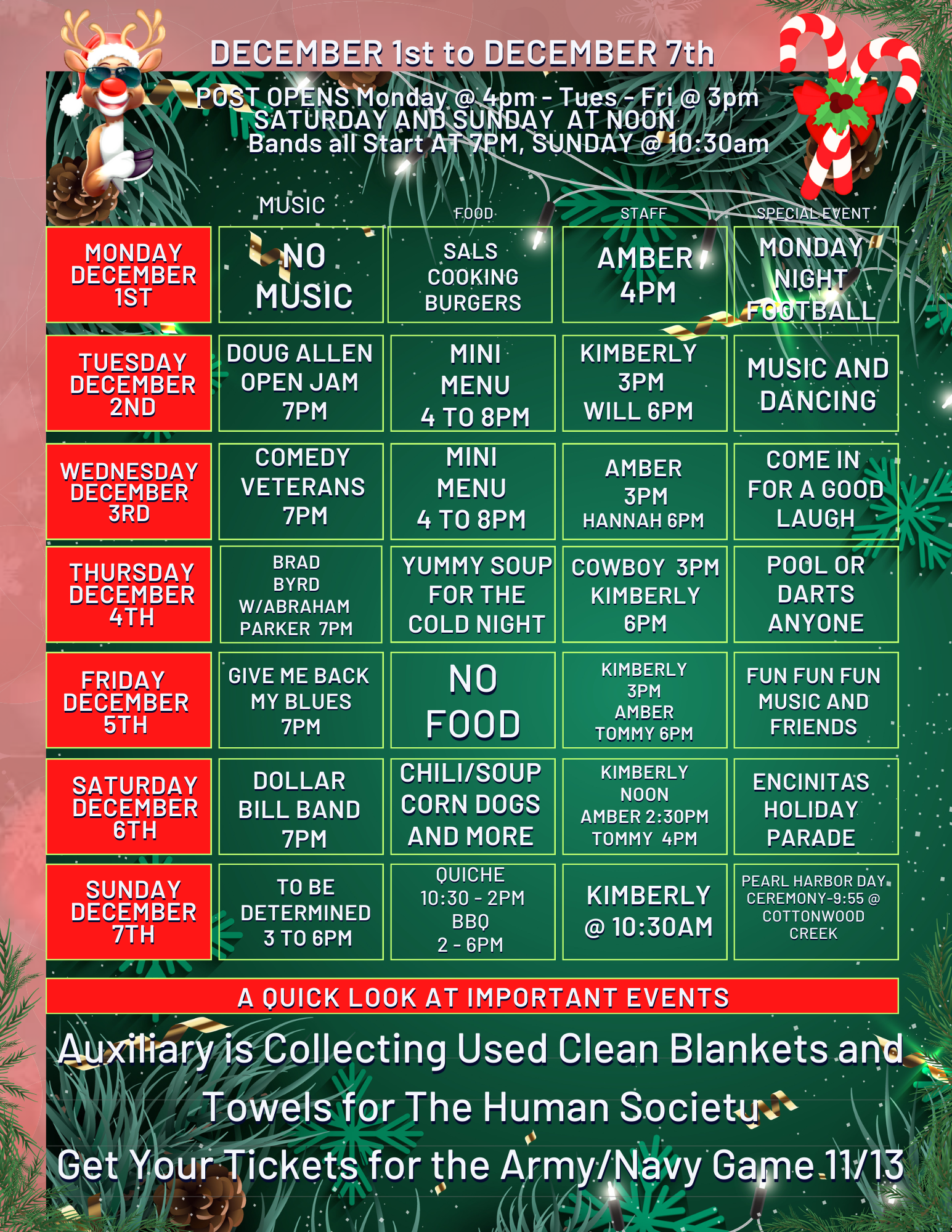 WHERE WILL YOU BE GAME DAY? Come watch the Army/Navy game with your fellow veterans. Post Members Free (For current members) Guests and Non-Post Members. $20.00 *Food (prepared by the …